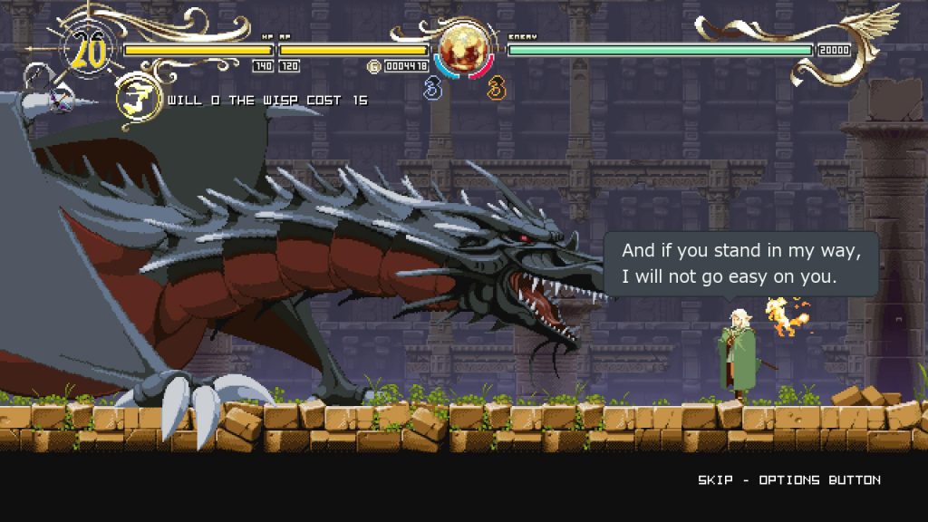Además, tenemos una mecánica que, creo, viene de los shmups, que es que tenemos dos tipos de magias, que afectan algunas de nuestras acciones: fuego y viento (aunque el viento parece agua, porque es celeste). (Notita: me confirma farinata que la mecánica viene de Ikaruga). Estas magias definen el elemento de nuestro ataque, así como también evitan que recibamos daño cuando recibimos magia ofensiva del mismo elemento que tenemos. Asimismo, al recibir magia del mismo elemento, ganamos unos cubitos que suben de nivel nuestro elemento, y que al llegar a nivel 3, nos cura progresiva y permanentemente el HP, además de darnos daño mejorado al usar el elemento en cuestión. Esto se detiene cuando nos pegan, pues nos baja el nivel del elemento. Dado que podemos cambiar de elemento con sólo presionar un botón, la cosa se presta para puzles entretenidos, y para mecánicas de combate ídem.