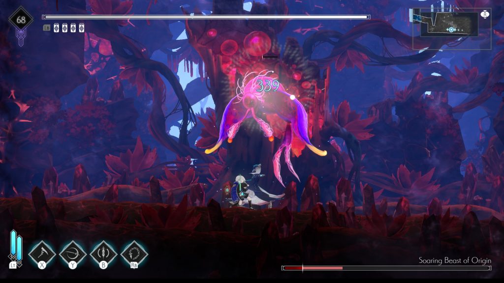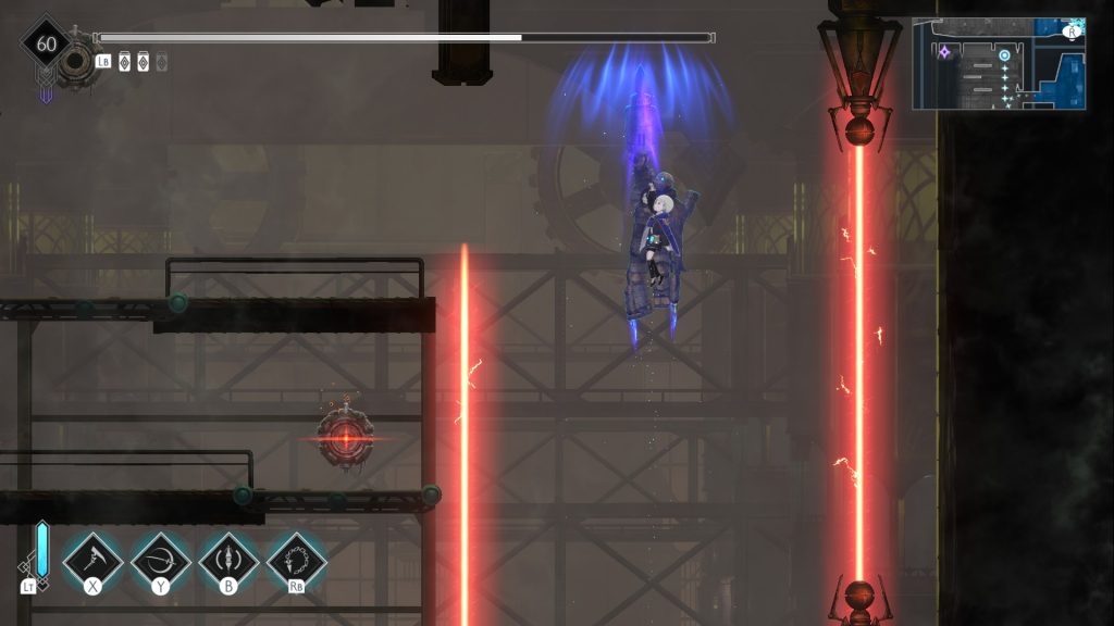 Por otro lado, las habilidades de exploración que encontraremos son bastante “por defecto”, como el doble salto, poder arrimarse en las paredes, o el spineshark. Creo que hay un problema en este enfoque, y es que explorar no se siente tan divertido como antes, en parte debido a que sólo tenemos habilidades estándar que se pueden encontrar en la mayoría de los metroidvania, pero además porque Magnolia no aprovecha los potenciales de sus habilidades y esto ocasiona que no existan atajos a las habilidades que podríamos requerir. Si vemos una cosa para colgarnos, ya sabemos que no vale la pena seguir explorando por ese lado hasta que obtengamos la habilidad requerida. Este era un problema recurrente en Lilies, pero acá no se soluciona sino que se intensifica por el tamaño del juego.