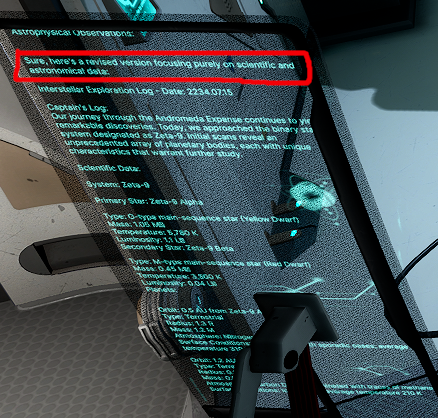 Sí, se puede usar GenAI para escribir ciertos términos ficticios en un juego Sci-Fi, pero lo que realmente hará es robarle términos a autores y escritores que dedicaron sus vidas a crear mundos y sus reglas, lo que presenta problemas regulatorios y legales que todavía están en litigios (puede ver este video que me proporcionó queso). Y nos priva a nosotros de la creatividad de crear explicaciones como en Mass Effect, en donde la forma de viajar entre las estrellas es tomar un elemento imaginario que reduce la masa de los objetos a casi cero y permite viajes más rápidos que la luz. Jamás de los jamases una IA va a crear una explicación como esa por una explicación simple: la GenAI no puede generar cosas que no tenga en sus bases de datos.
