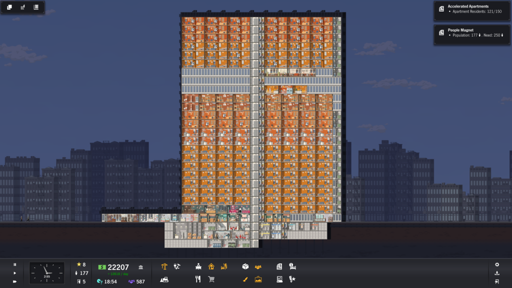 Con una premisa idéntica a la de SimTower, acá construiremos un rascacielos lo suficientemente alto como para ser la envidia del Costanera Center. Comenzando con nada más que un segundo piso, podremos ampliar nuestra torre para dar espacio a oficinas, departamentos, habitaciones de hotel y comercio de todo tipo. Podremos elegir lo que queramos hacer y en qué enfocarnos, siendo nuestro objetivo el poder crecer y seguir creciendo para seguir ganando dinero.
