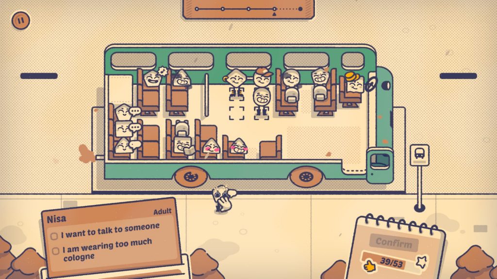 Un juego sencillo de puzles, en donde tendremos que organizar el cómo nuestros personajes se sentarán en un bus. En cada mapa habrá una cantidad determinada de espacios en donde los personajes podrán sentarse, detenerse, comer y otros etcéteras, pero también existirán condiciones que estos personajes exigirán. Por ejemplo, a algunos no les gusta la música fuerte, así que no podremos ponerlos con los flaites que escuchan música con su radio a todo volumen. O los hediondos tendrán varios detractores de la higiene y tendremos que aislarlos.