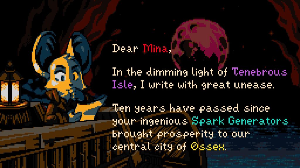 Al igual que su predecesor, este jueguito prefiere las gráficas retro, mas, a diferencia del caballero de la pala, esta vez nos vamos por algo más Game Boy que NES. Asimismo, en la línea del gameplay, donde Shovel Knight toma inspiración de los plataformeros de la Nintendo original, Mina se inspira en los Zeldas del ladrillo portátil, pero con relación de aspecto 16:9.