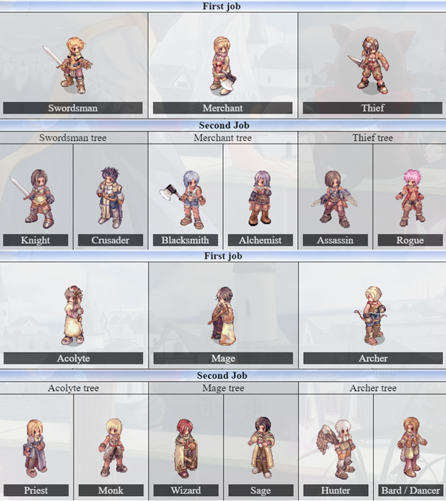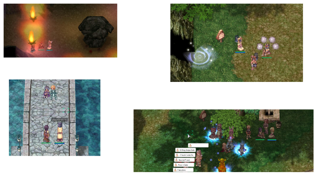 Como cada personaje cumple un rol específico, la tónica del RO se basaba en juntarte con personajes de otras clases y aventurarse juntos sacando provecho de las capacidades individuales. El cazador ataca a distancia con su arco mientras el cruzado resiste daño, acompañado del caballero y asesino que gracias a su velocidad de ataque se encargan de reducir el HP de los enemigos. Atrás están los priests dando cura, bardo y bailarina apoyando con canciones, y los magos colapsando la pantalla con magias de área. Tras una agitada sesión, se reparten los ítems en base a las necesidades de cada usuario. Si lo que lees te suena conocido, es porque no es muy diferente a otros MMORPG, y al igual que en otros mundos virtuales, si te aburres de explorar las mazmorras y vencer sus jefes, las guerras entre clanes y los duelos player versus player son complementos que rompen con la monotonía del modo jugador contra el entorno.