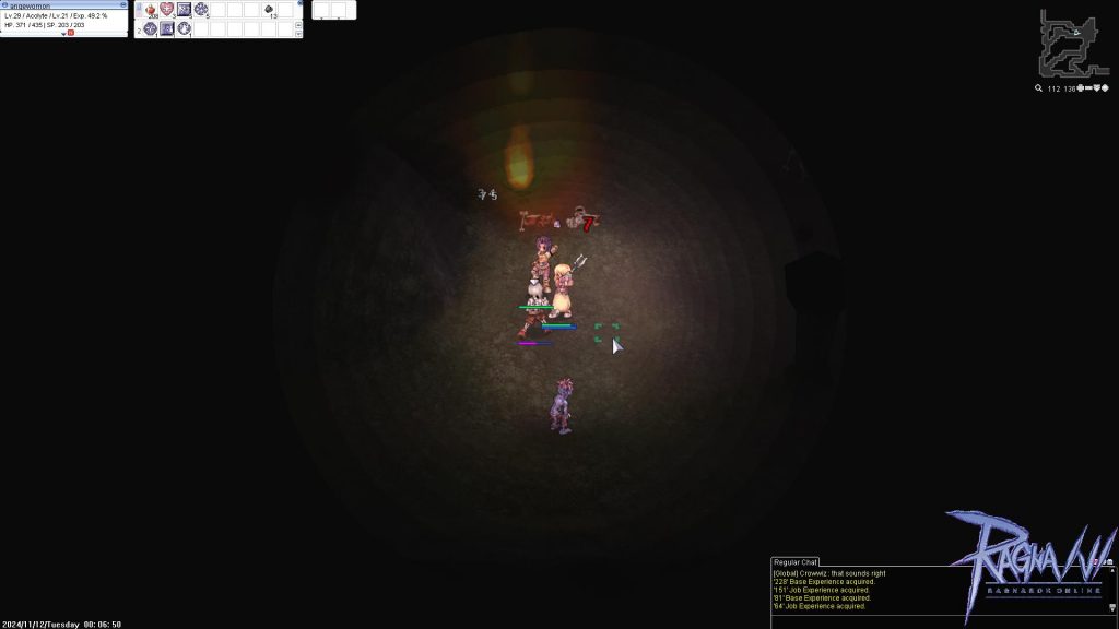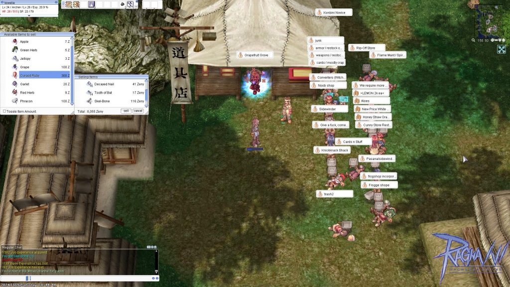 Esto es únicamente una parte menor de la población del server. La mayoría de los usuarios conectados son mercaderes vendiendo ítems vía autotrade (te desconectas y tu avatar sigue online), y quizás solo el 10% del valor total son personas que realmente se encuentran jugando. Esta es la realidad de Ragnarok Online a 21 años de su lanzamiento, cada servidor es un pequeño mundo específico para un grupo de amigos particular. Parece intimidante el acercarte a extraños veteranos, mas, ocurre lo opuesto; para ellos, ver a un usuario nuevo es sinónimo de alegría, porque estás habitando un espacio que ellos levantaron. Te diste el tiempo de buscar el agujero del conejo, adentrarte y ver que había del otro lado.