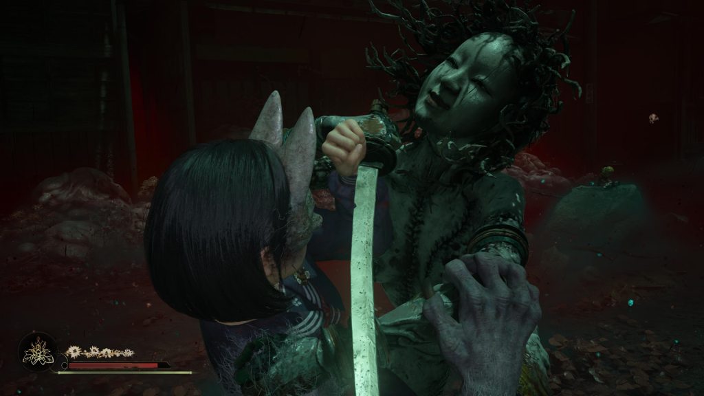 Sobre todo al principio, nuestro espacio de inventario será muy limitado, lo que nos obligará a usar ítems constantemente, o utilizarlos como ofrenda en los santuarios shizo, que también funcionan como puntos de guardado y de mejora de stats. ¿Para qué sirve darlos como ofrenda? Para obtener puntitos de fe, que nos servirán para mejorar stats, comprar omamori o aumentar la cantidad que podemos tener equipados, y recargar nuestra sanidad (en niveles más alto de dificultad). En el caso de mejorar stats y aumentar los omamori que podemos equipar, necesitaremos un ítem llamado “ema” además de una cantidad cada vez más alta de fe. No es muy complejo, y le da un poco más de profundidad al combate. Y a propósito de combate…