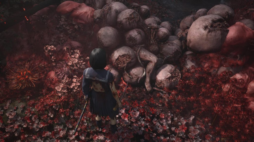 En términos de diseño visual, Silent Hill f conserva bastante de body horror de los juegos del pasado, con algunas escenas que dan harta cosita. No miedo, cosita. Sí se eliminó totalmente la estética industrial venida a menos del otherworld, siendo reemplazada por una estética japonesa de misterio más “tradicional”.